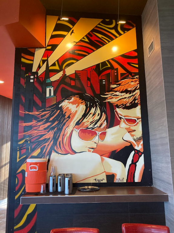 Eventually, an incident occurred, requiring the wall to be repaired. As a result, the mural was updated with a vinyl print of its previous appearance (see images below)