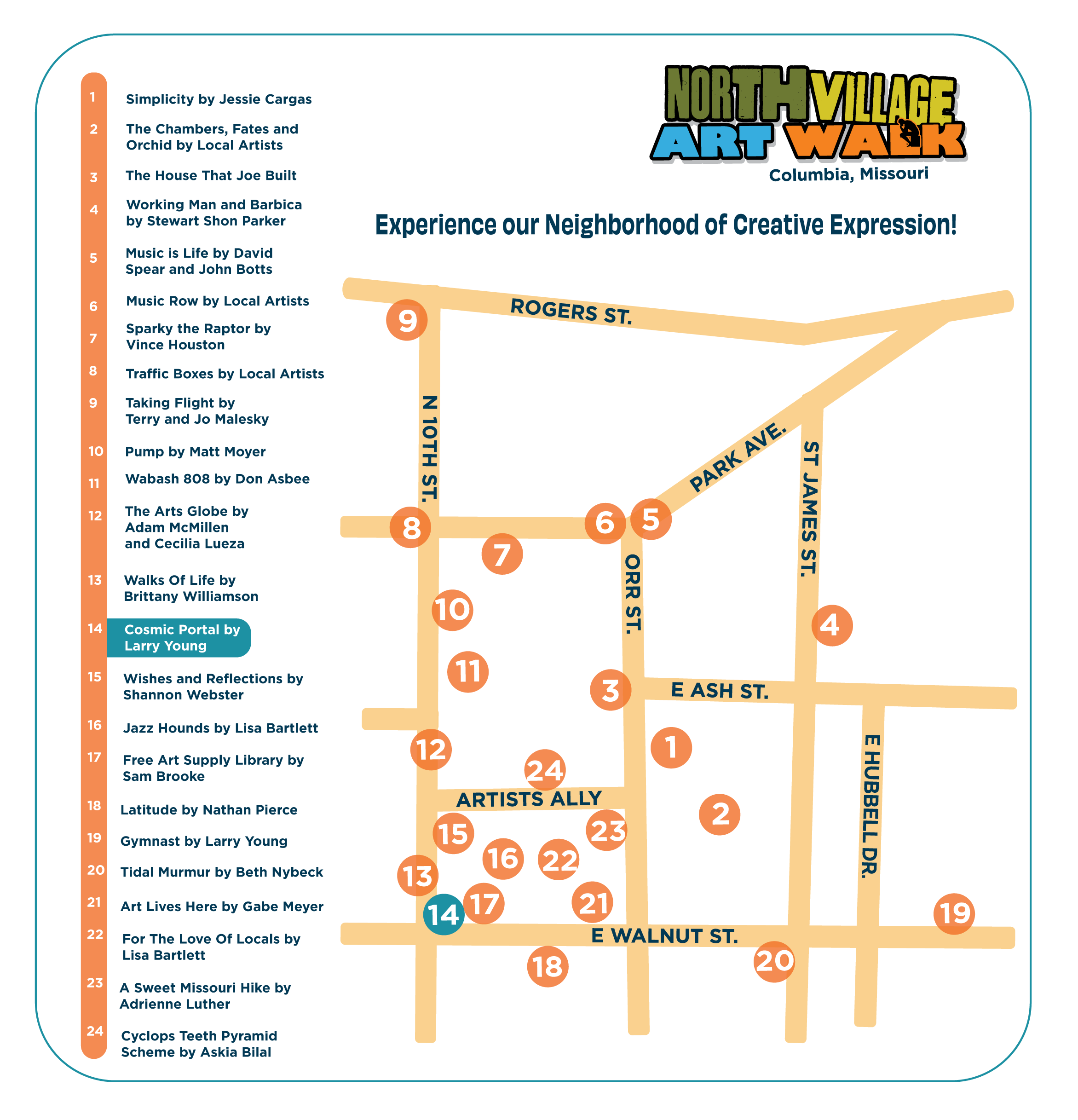 The Cosmic Portal sculpture can be found in front of the Walnut building, on the corner of N Walnut and 10th St