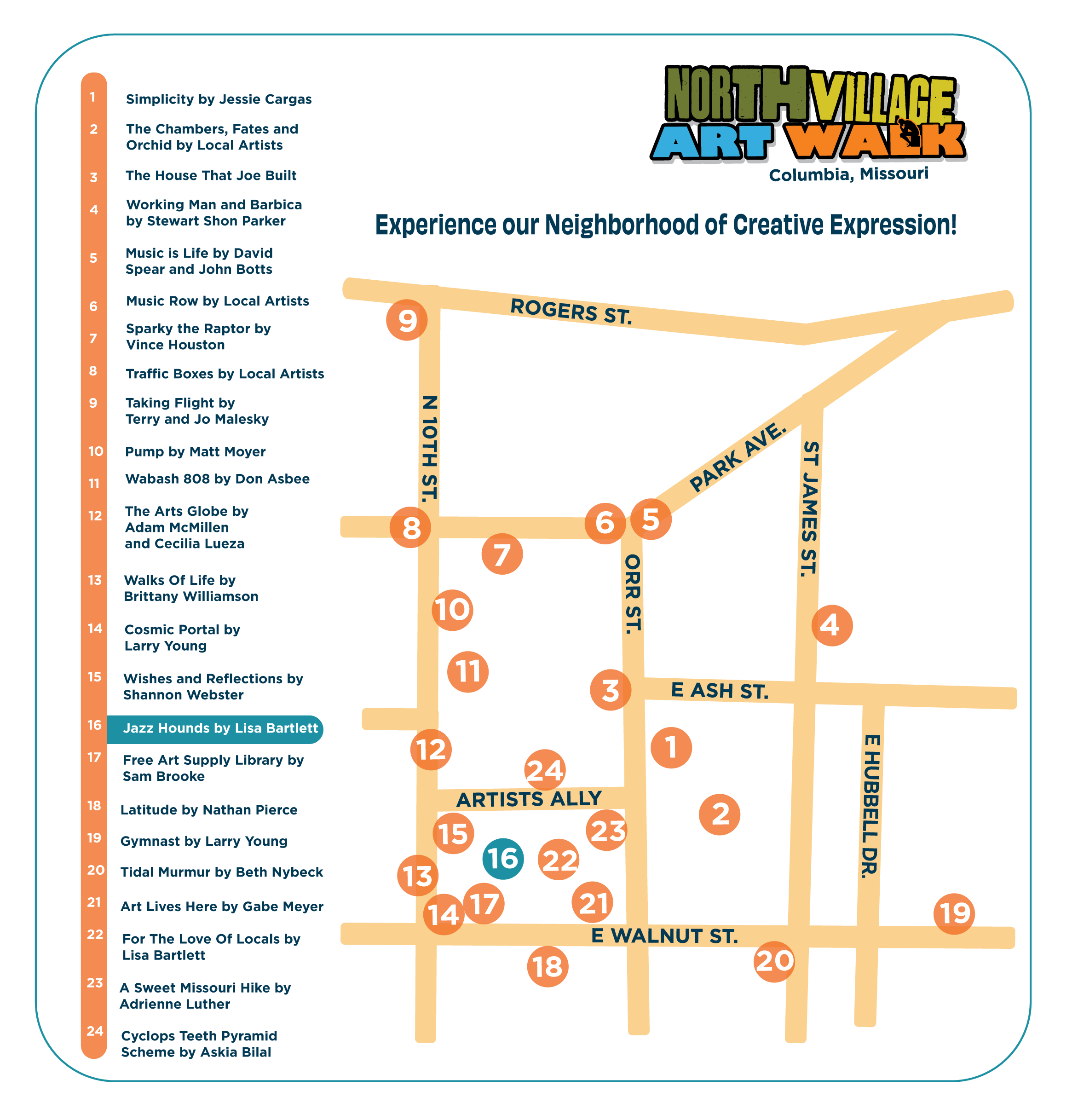 Lisa is a board member of the North Village Arts District and owns Artlandish Gallery, a fine art and fine craft gallery. She also has a working studio at Orr Street Studios, where she creates in various mediums, including sculpture with found materials and a variety of paintings. Bartlett's work incorporates an element of mystery, encouraging viewers to explore and engage more deeply.