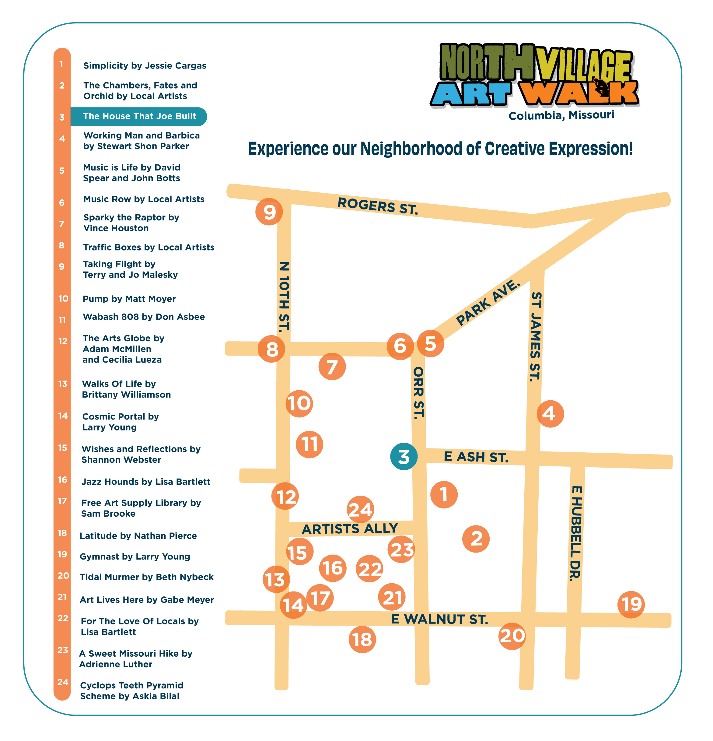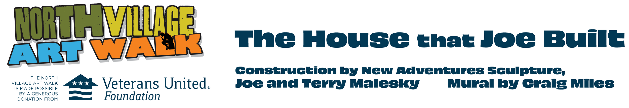 The House that Joe Built can be found on the North Village Art District’s Adopt-a-Spot, next to the Fire Department and the trash compactor, in the Wabash bus station parking lot!