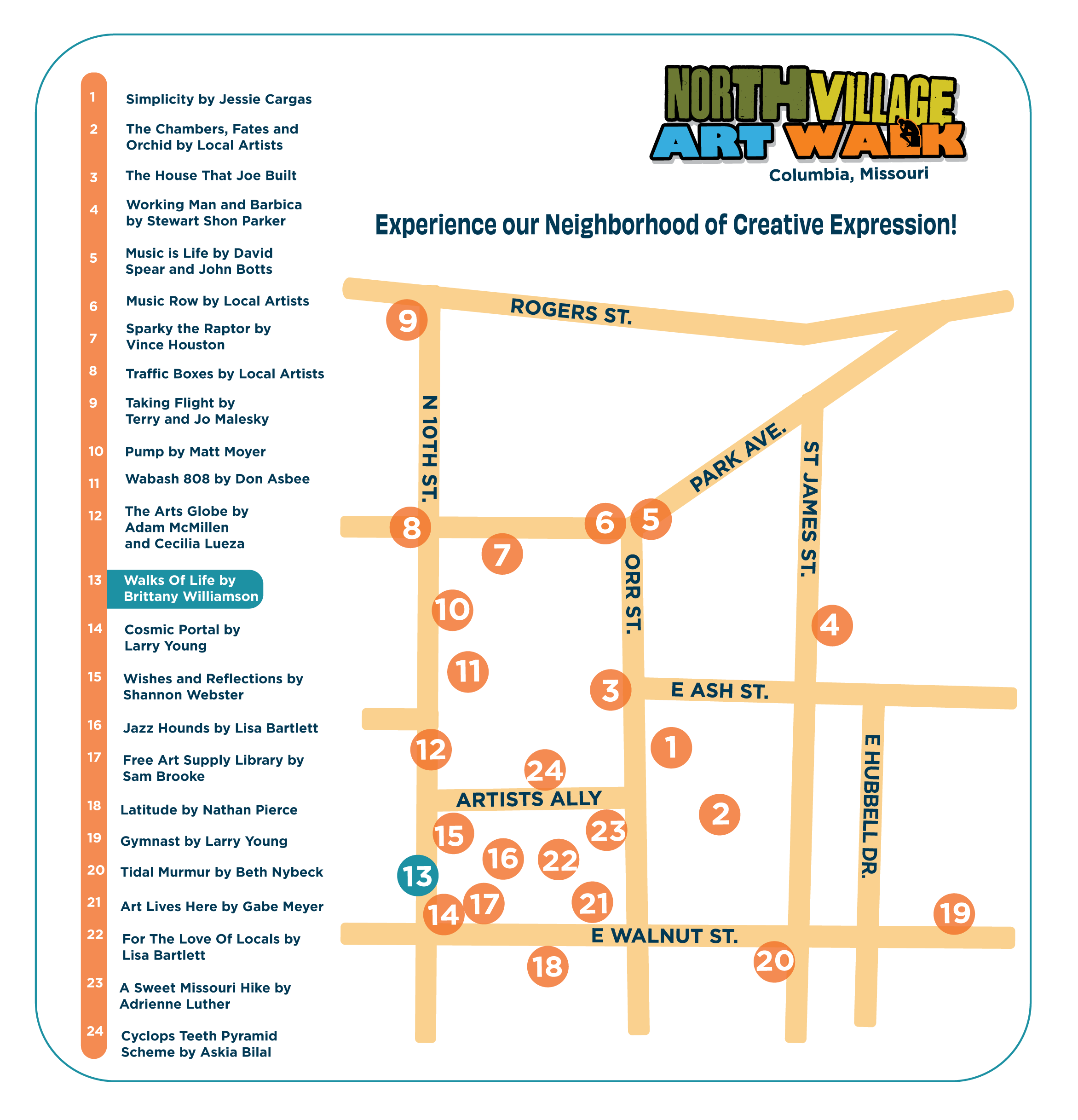 Titled “Walks of Life,” the mural represents the diverse group of people that come from all walks of life. Williamson’s mural depicts “Pop Art” shoes in bright colors, completed using paint, stencils, spray paint, and black outlining.